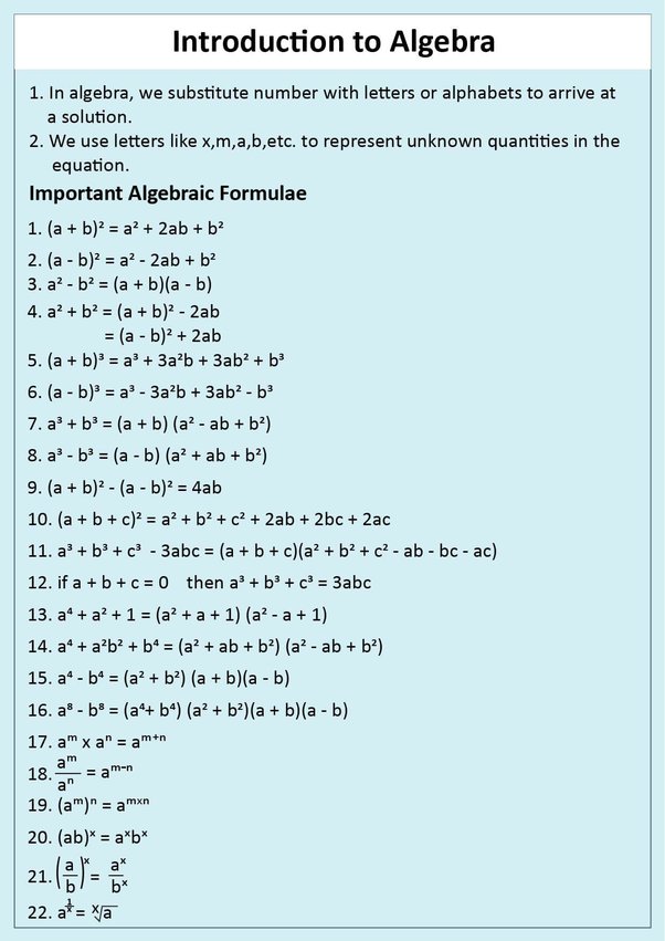 (a + b)2 = a2 + 2ab + b2, and try to . Algebraic formulae online worksheet for form 2. You can do the exercises online or download the worksheet as pdf. Algebraic formulae this video have subtitle in malay and/or english the aim for this video is to help dlp students . Algebra formulas form the foundation of numerous topics of mathematics. L = 1 2 t h l = \dfrac{1}{2} th l=21th.